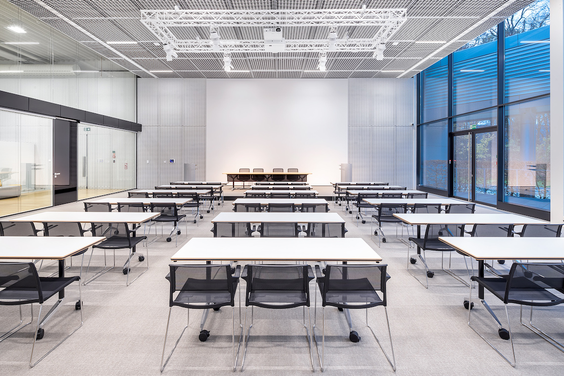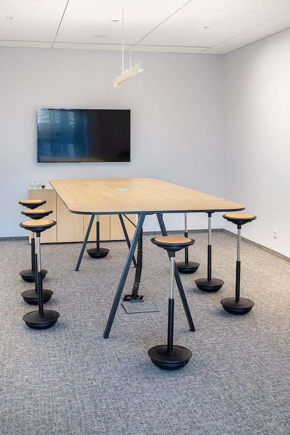 The right shoes need to strengthen, support and encourage feet to move and the same applies to choosing the right office furniture. So the architects picked Wilkhahn’s ON free-to-move office chair with its three-dimensional synchronous adjustment mechanism (design: wiege). Minute stimuli are all that are needed to inspire people to move but their body’s centre of gravity is maintained whatever posture they adopt. In other words, ON really has taught seating to walk – the sort of capability that’s bound to be vital to a shoe manufacturer. The dynamic one-leg Stitz (design: ProduktEntwicklung Roericht) is also used in the conference room. It motivates users to alternate between standing and sitting, boosts their metabolism and improves their sense of balance. Stitz is also multipurpose – something that’s very important at CCC’s research and development centre. And the furniture also complies with the stringent demands for flexibility in the large meeting and conference room, one of the centre’s communicative hubs. The combination of the mobile Timetable conference tables and the Aline stackable skid-base chairs (both designed by Andreas Störiko) allows people to configure various settings according to needs and put them back again.