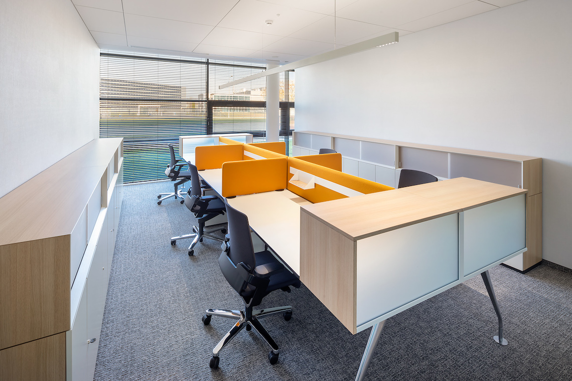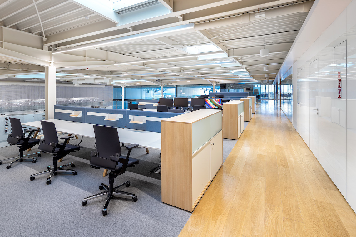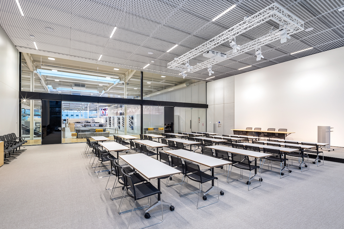 The architects transformed the 5,500-square-metre erstwhile production facility into a modern working environment. In order to create a multipurpose space, the room wasn’t just modernised in terms of the structural engineering and acoustics, but a gallery was added to one side. The previous warehouse and its high ceilings make this building with its new rooms and recessed levels possible, all of which benefit from the special appeal of the space. At the same time, the hall belonging to the research and development centre and its industrial charm are still obvious. The exposed ceiling also boldly reveals the building’s technical infrastructure, with supports required from a structural engineering standpoint dividing the open-plan room up into different workspaces. Large panes of glass on the façade allow plenty of natural light into the interior and through the glass walls on the inside too. The result is a flowing transition between the different rooms with the multipurpose workspaces merging with each other.