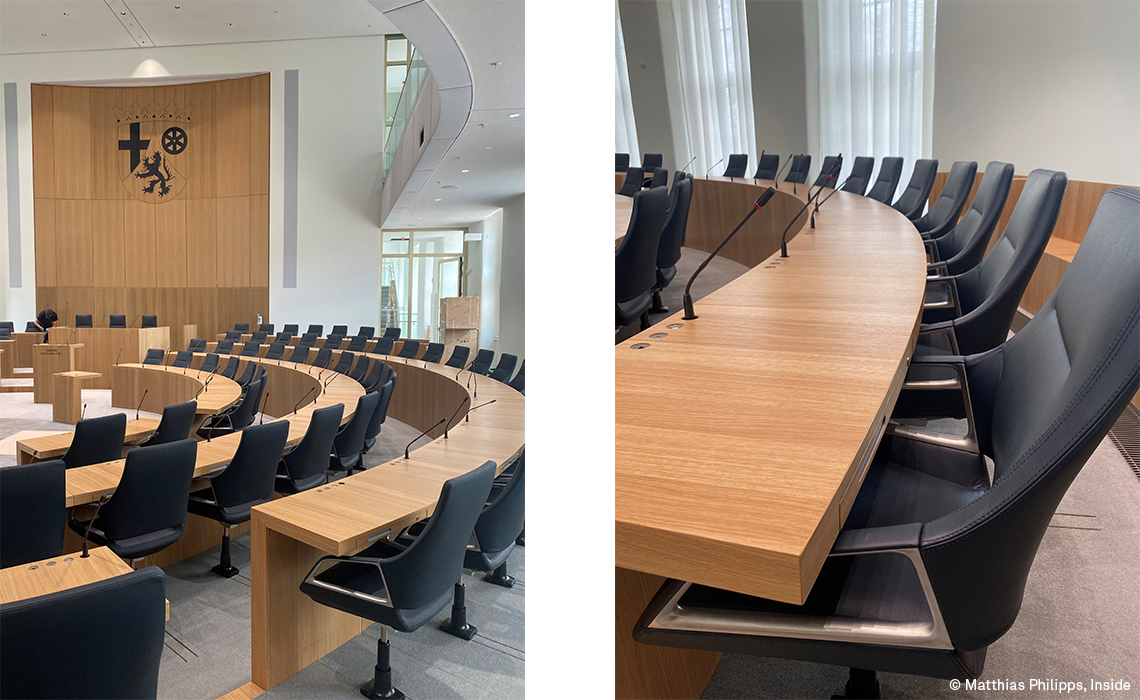 Das im Zweiten Weltkrieg bis auf die Grundmauern zerstörte Deutschhaus war Anfang der 1950er Jahre in nur 150 Tagen wiederaufgebaut worden. Rund 65 Jahre später entsprach es jedoch nicht mehr den funktionalen Anforderungen an ein zeitgemäßes Landtagsgebäude – vom Brandschutz über die Barrierefreiheit bis hin zur Haus- und Konferenztechnik. Während die denkmalgeschützte Fassade erhalten blieb, ließ der Architekt Linus Hofrichter das Innere des Gebäudes komplett entkernen und neu errichten. Die Herausforderung der Sanierung bestand darin, den historischen Charakter des Gebäudes zu erhalten und gleichzeitig ein offenes und zeitgemäßes Raumerlebnis zu erzeugen. Das Ergebnis kann sich sehen lassen: Konträr zur barocken, verspielten Außenhülle präsentiert sich der Innenraum nun hell und modern.