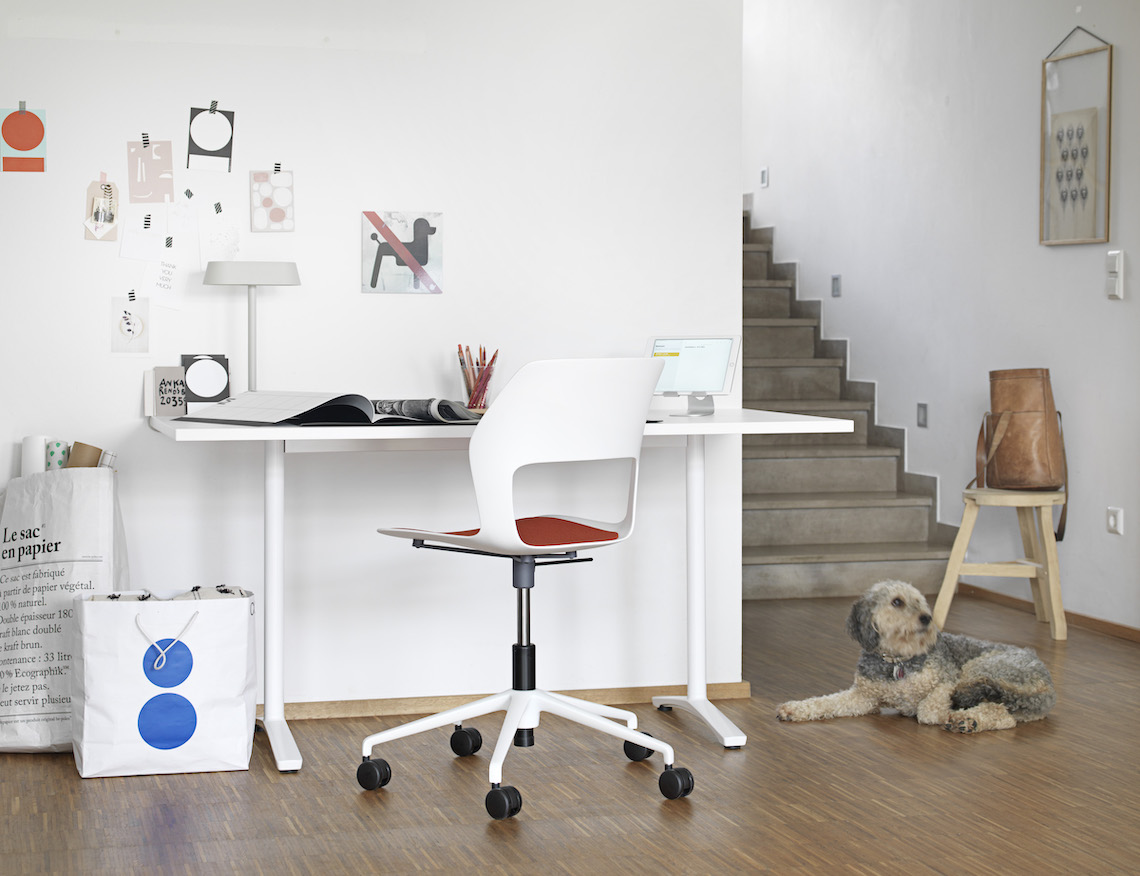 Zusammen mit dem besonders kompakten und wohnlichen Aline-Tisch (Design: Andreas Störiko) entsteht ein Homearbeitsplatz aus Tisch und Stuhl, die bei Bedarf auch den Essplatz und die Bestuhlung erweitern können. Foto: Wilkhahn