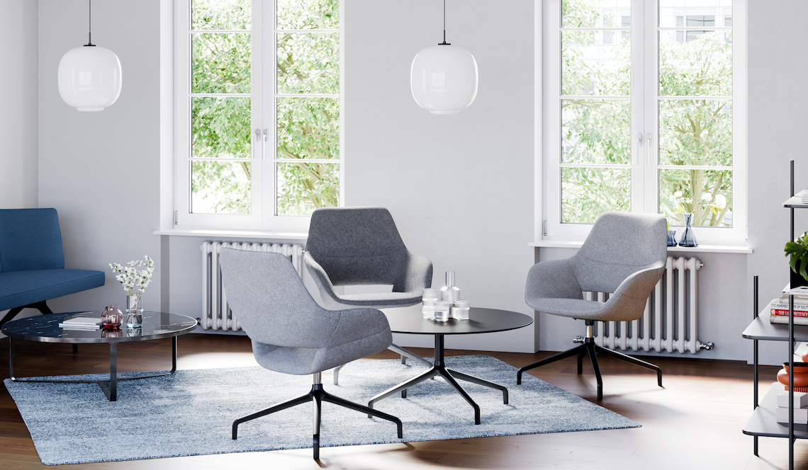 Occo goes Lounging: Die neuen Sesselmodelle mit komfortabler 8°-Rückneigung ergeben im Zusammenspiel mit den niedrigen Beistelltischen das perfekte Setting für den entspannten Austausch im Büro oder zuhause. Foto: Wilkhahn