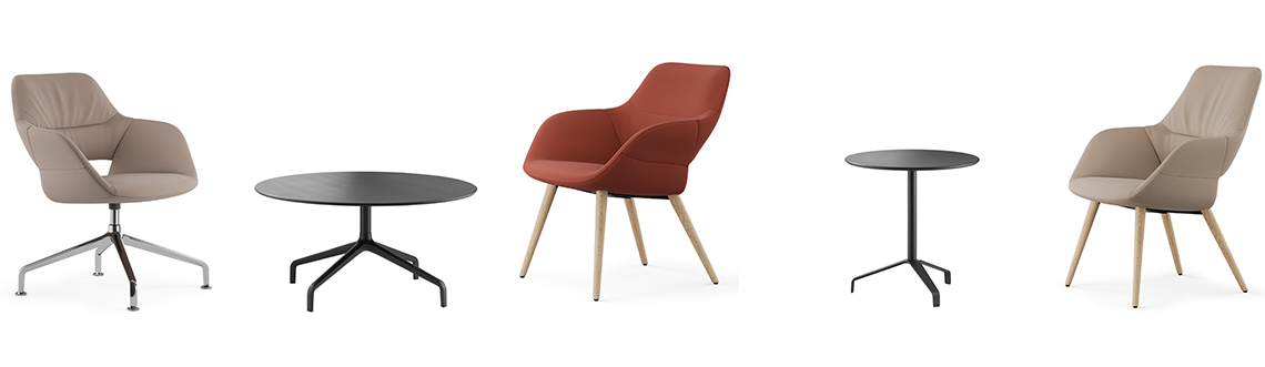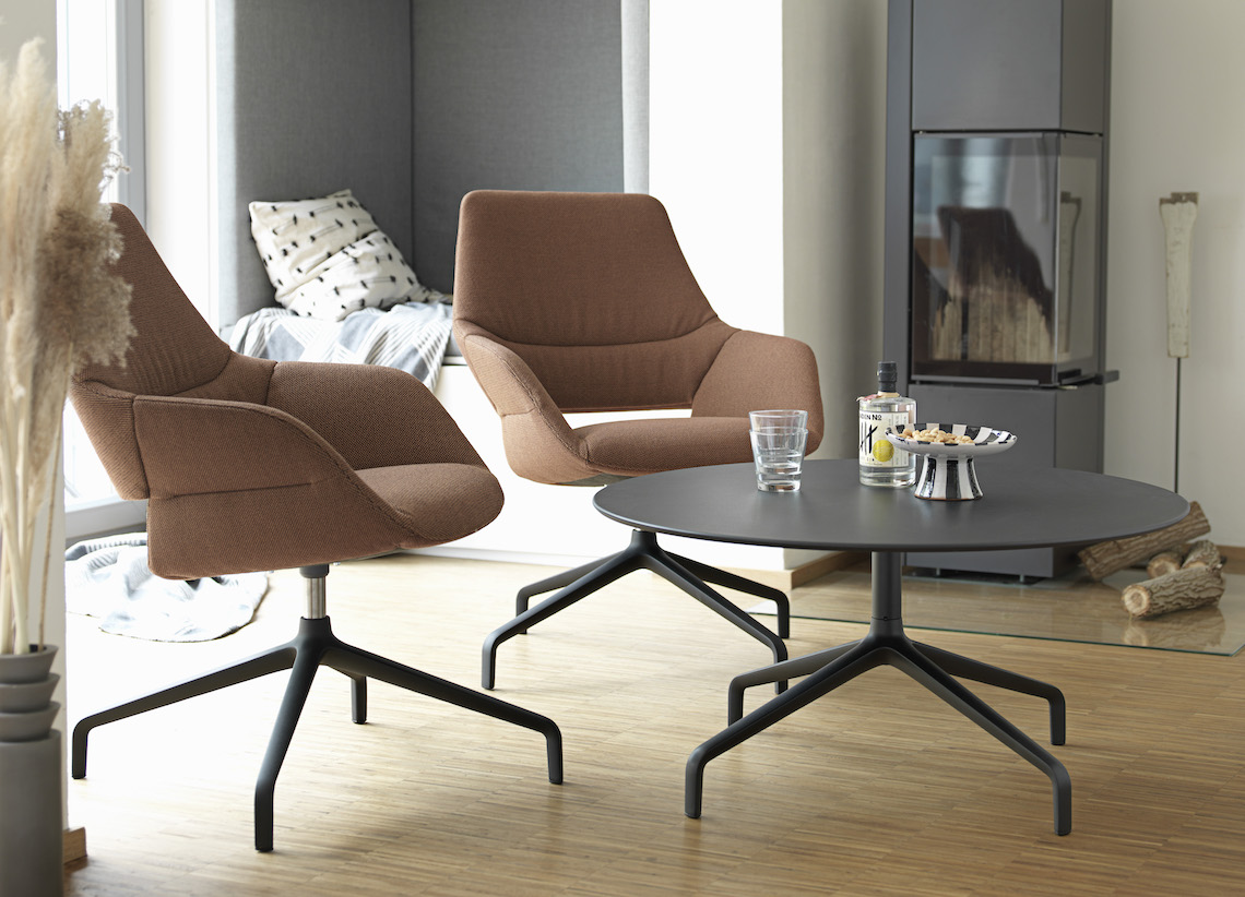 Auf den gleichen Kontext zielen die neuen Modelle mit niedrigen Gestellvarianten: Hier sind die Sitzschalen um 8° nach hinten geneigt auf das Gestell montiert, das wahlweise als Aluminium-Fußkreuz oder als vierbeiniges Massivholzgestell verfügbar ist. In Kombination mit den beiden Rückenhöhen und Polstervarianten ergibt das acht neue Loungesessel-Modelle, die sich zudem mit den passenden Tisch-Modellen kombinieren lassen. Das Programm hält hier eine Auswahl an runden und quadratischen Tischflächen mit baugleichem Fußkreuz in 45 cm Beistellhöhe sowie einen kleinen, dreibeinigen Rundtisch mit 50 cm Höhe bereit.