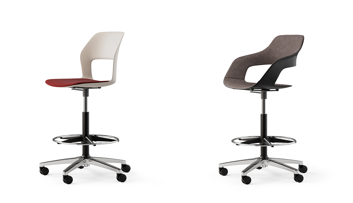 Noch weiter in die Höhe geht es bei den Occo- und Occo SC-Modellen mit Counterstuhl-Gestellen. In Meeting-, Projekt- und Workshopräumen kommen immer häufiger Stehtische zum Einsatz, an denen sich Sitzende und Stehende durch den Einsatz von Counterstühlen auf Augenhöhe begegnen können. Für die Gewährleistung der Kippsicherheit sorgt das größere Fußkreuz, für die individuelle Einstellung eine höheneinstellbare Drehsäule mit justierbarem Fußring.
