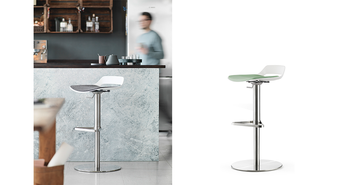 Auf die gleiche Arbeitshöhe zielt das neue Barstuhl-Modell, das zusätzlich zu den Ausführungen mit Kufengestellen und Massivholzbeinen erhältlich ist: Die bestehende Sitzschale in sechs Farb- und drei Polstervarianten thront hier auf einer dreh- und höhenverstellbaren Edelstahlsäule mit Fußstütze und Tellerfuß. Das prädestiniert das Modell vor allem für beengte Raumverhältnisse wie etwa am heimischen Küchentresen oder in der (vor Corona-Zeiten) flächenoptimierten Gastronomie.