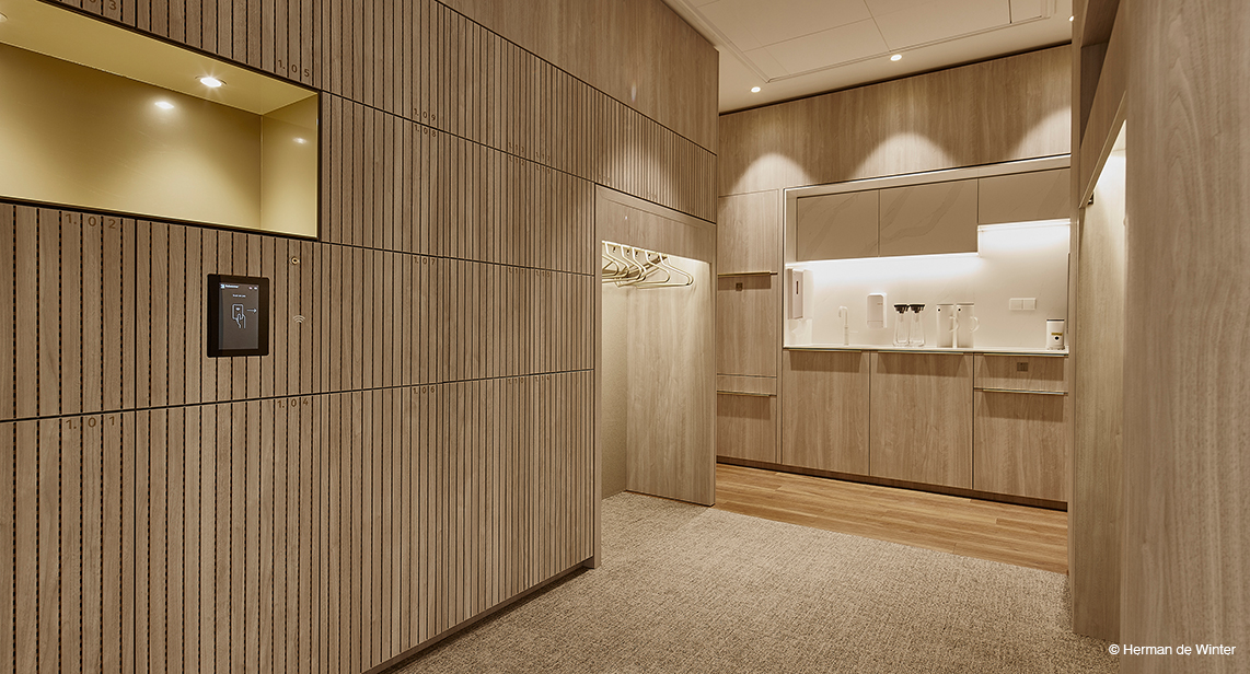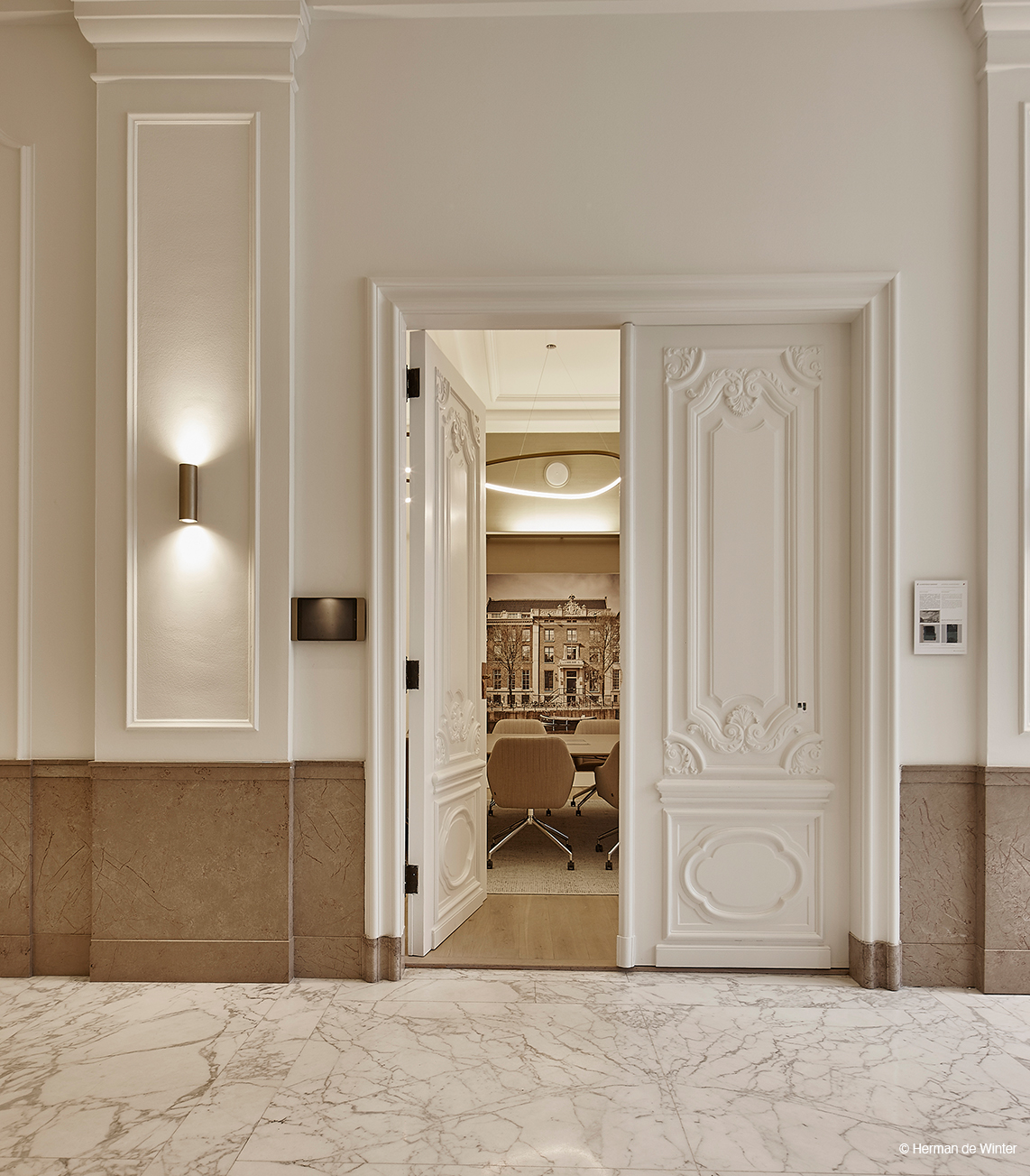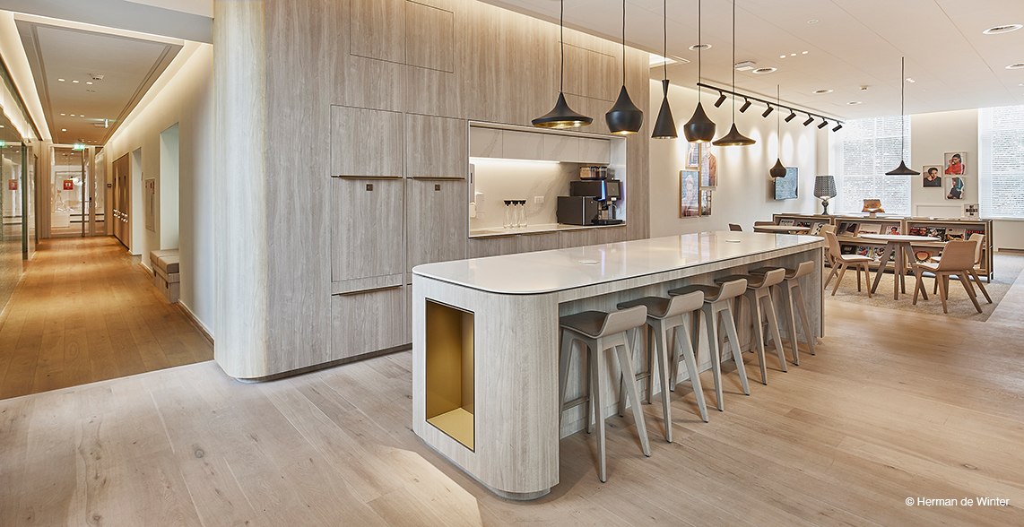 El edificio de oficinas fue construido en 1953 y tiene siete pisos; el superior se ha reconvertido en un lounge para conferencias con restaurante que ofrece una vista hermosa del barrio antiguo de Ámsterdam. El diseño se basa en los tonos cálidos de color beige y el mobiliario, de la máxima calidad, se fabricó con madera de fuentes sostenibles, mármol y latón. Así, el nuevo interiorismo concuerda con el lema de Richemont: la calidad se refleja en el cuidado por los detalles y en la calidad de las labores artesanales.