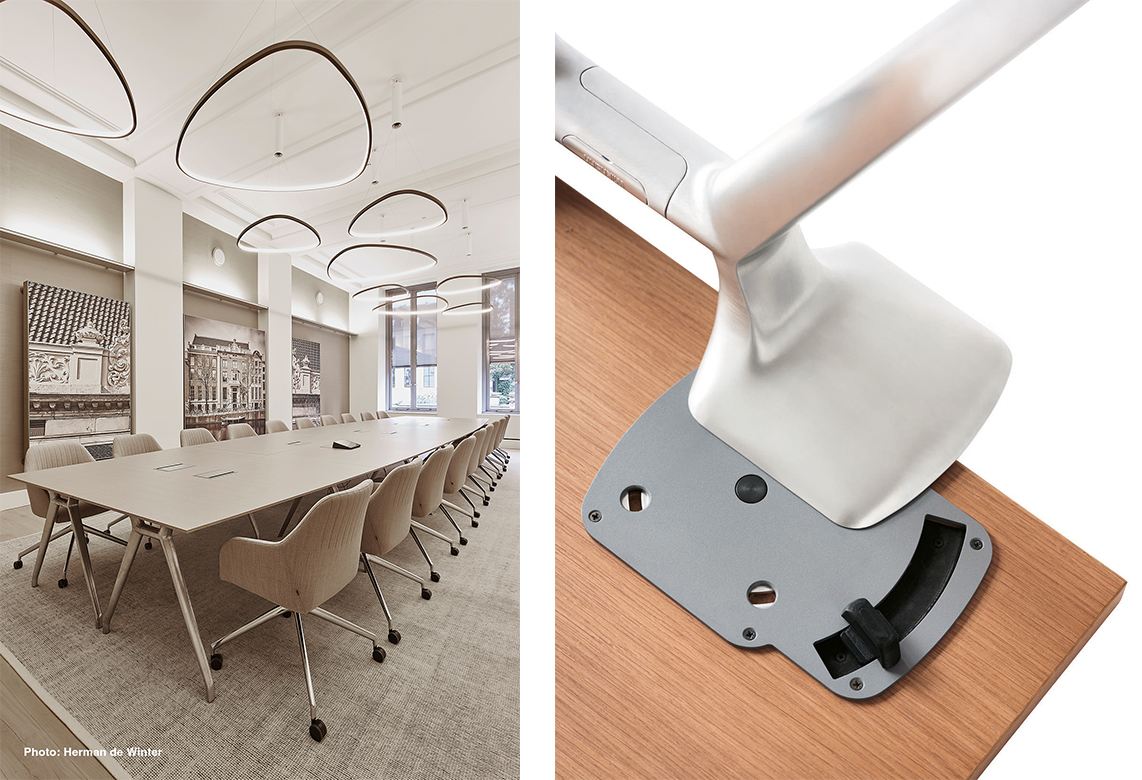 Los edificios históricos y los espacios de trabajo situados en el edificio de los años cincuenta se equiparon parcialmente con mesas y sillas de oficina de Wilkhahn. La mesa de conferencias modular Versa, diseñada por Wolfgang C. R. Mezger, responde a los requisitos de los entornos laborales contemporáneos, centrados principalmente en la flexibilidad y la comunicación. Están equipadas con un cierre de bayoneta gracias al cual los armazones, de fundición de aluminio, se pueden unir fácilmente a los tableros de las mesas en distintas configuraciones y sin usar ningún tipo de herramienta. Se trata de un innovador sistema de mesas que se puede ampliar o reducir en todo momento y, por lo tanto, adaptar a los requisitos y necesidades de cada circunstancia.