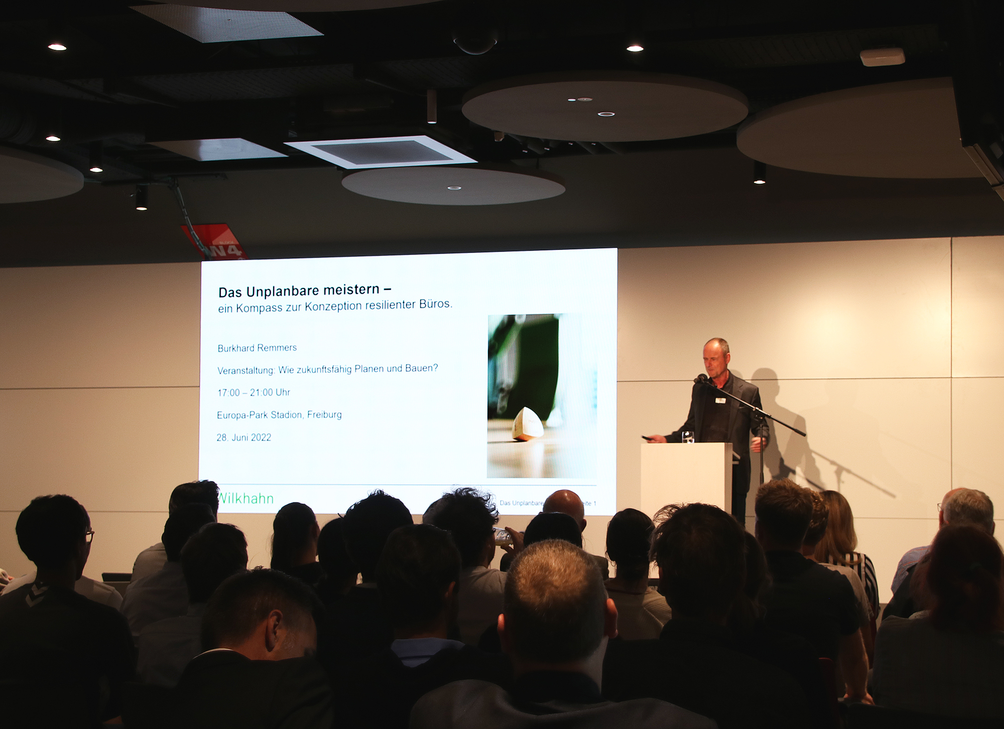 Burkhard Remmers de Wilkhahn a présenté les dimensions essentielles des immeubles de bureaux orientés vers l’avenir en s’appuyant sur la projection numérique « Human Centered Workplace », réalisée en collaboration avec le cabinet d’architectes 1zu33 pour une maison d’édition fictive du quartier Nordhavn à Copenhague. Ensuite, Antonino Vultaggio de HPP Architekten a expliqué dans le cadre d’une intervention passionnante les bases complexes de la planification du stade et le concept de construction durable des bureaux. Plus de 70 invités ont suivi avec grand intérêt les deux conférences, qui avaient été préalablement validées à titre de formation continue par la Chambre des architectes du Bade-Wurtemberg.