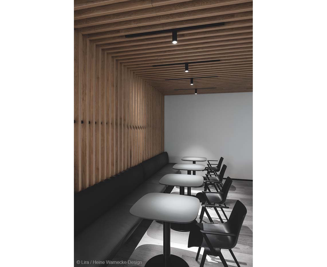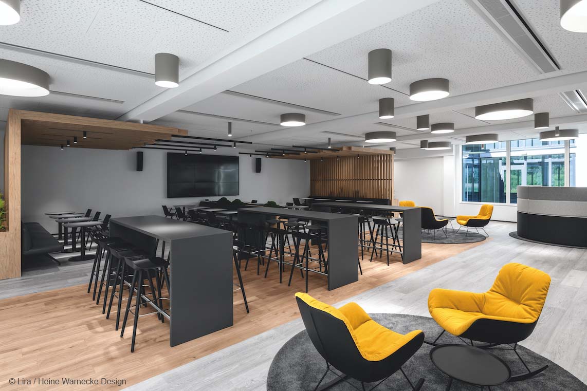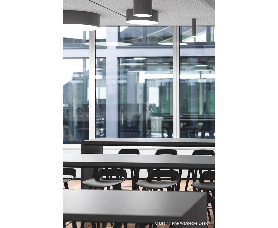 Le bâtiment de liaison elliptique constitue un contrepoint formel avec les deux corps latéraux. À l’intérieur se trouvent le hall d’accueil central, différentes salles de réunion et ce que l’on appelle un casino, utilisé principalement comme cantine. Une salle de jeux avec baby-foot et Playstation permet de se changer les idées au cours de la journée de travail, et l’aile centrale peut accueillir jusqu’à 100 personnes à l’occasion d’événements. L’architecture intérieure, conçue par l’équipe de design de pro office Lemgo, mise ici explicitement sur la diversité des matériaux, le confort et les différentes possibilités d’utilisation. Un terminal d’accueil en libre service en bois au design exceptionnel attire les regards sur la zone d’accueil, et des meubles rembourrés, des fauteuils lounge et des chaises à bascule disposés dans le casino permettent de se mettre en retrait en s’isolant du bruit. La cantine au caractère haut de gamme est quant à elle aménagée avec des tabourets de bar Occo à piètement en bois massif teinté noir (design : jehs+laub) et des chaises empilables universelles Aula aux couleurs assorties (design : Wolfgang C.R. Mezger).