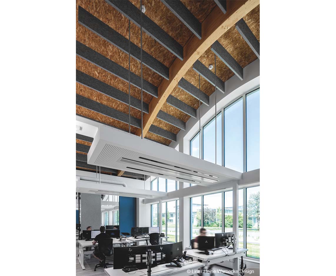 Environ 60 collaborateurs et collaboratrices du prestataire de services informatiques gèrent en exclusivité les 40 sites du fabricant de bois dans le monde. Les capacités et l’utilisation des nouveaux locaux de travail ne s’arrêtent cependant pas là. Outre le suivi des systèmes numériques du traitement des ventes, des processus d’achat et de la logistique de production, de stockage et d’expédition, une assistance classique y est également assurée. La nouvelle construction en trois parties offre aussi de l’espace pour des événements internes. C’est ainsi qu’est né un immeuble de bureaux d’une surface utile totale d’environ 2500 mètres carrés, dont l’architecture expressive a de quoi séduire.