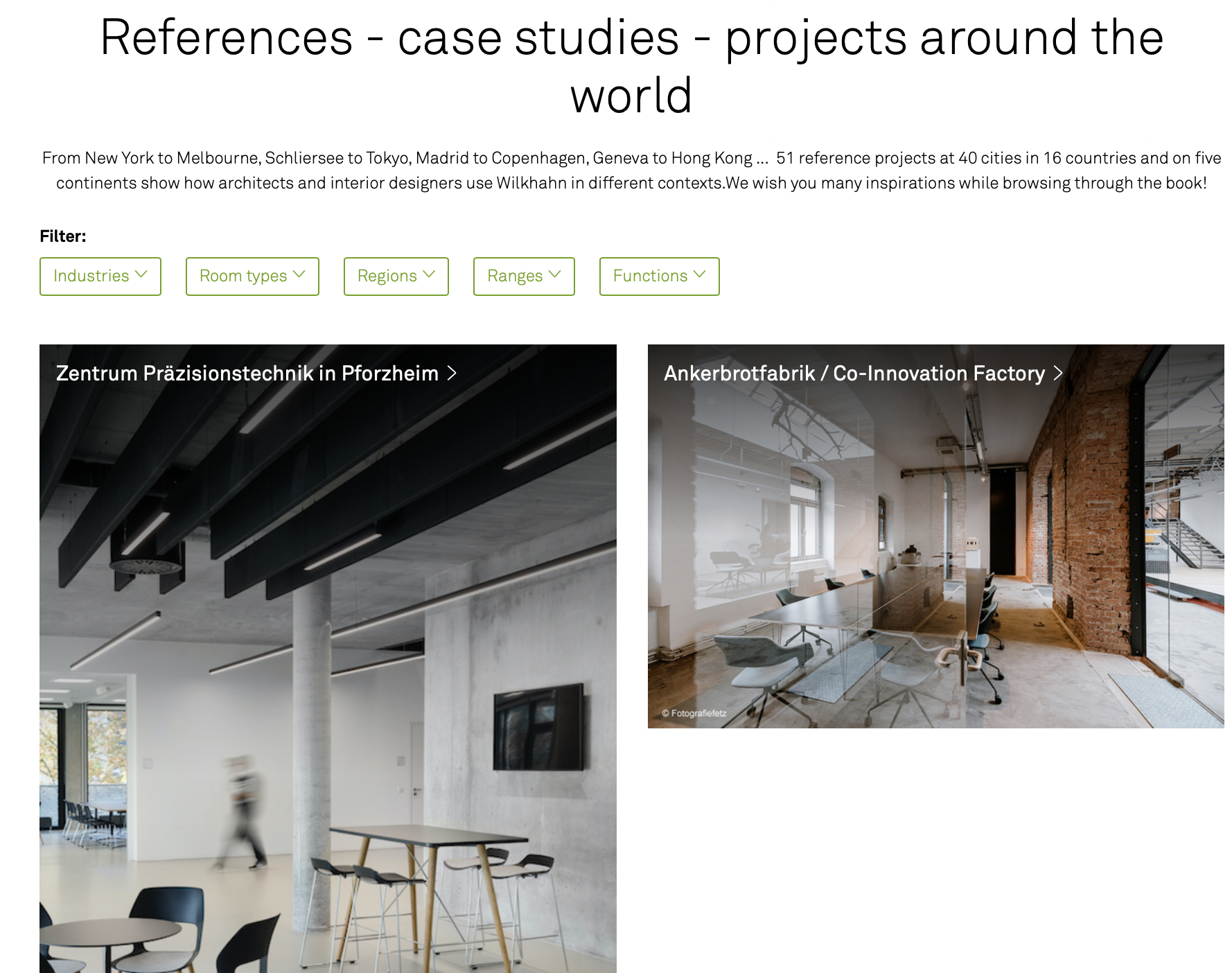 Différents filtres permettent de trier les projets de référence du monde entier et aident à la recherche. (seulement en allemand et anglais)