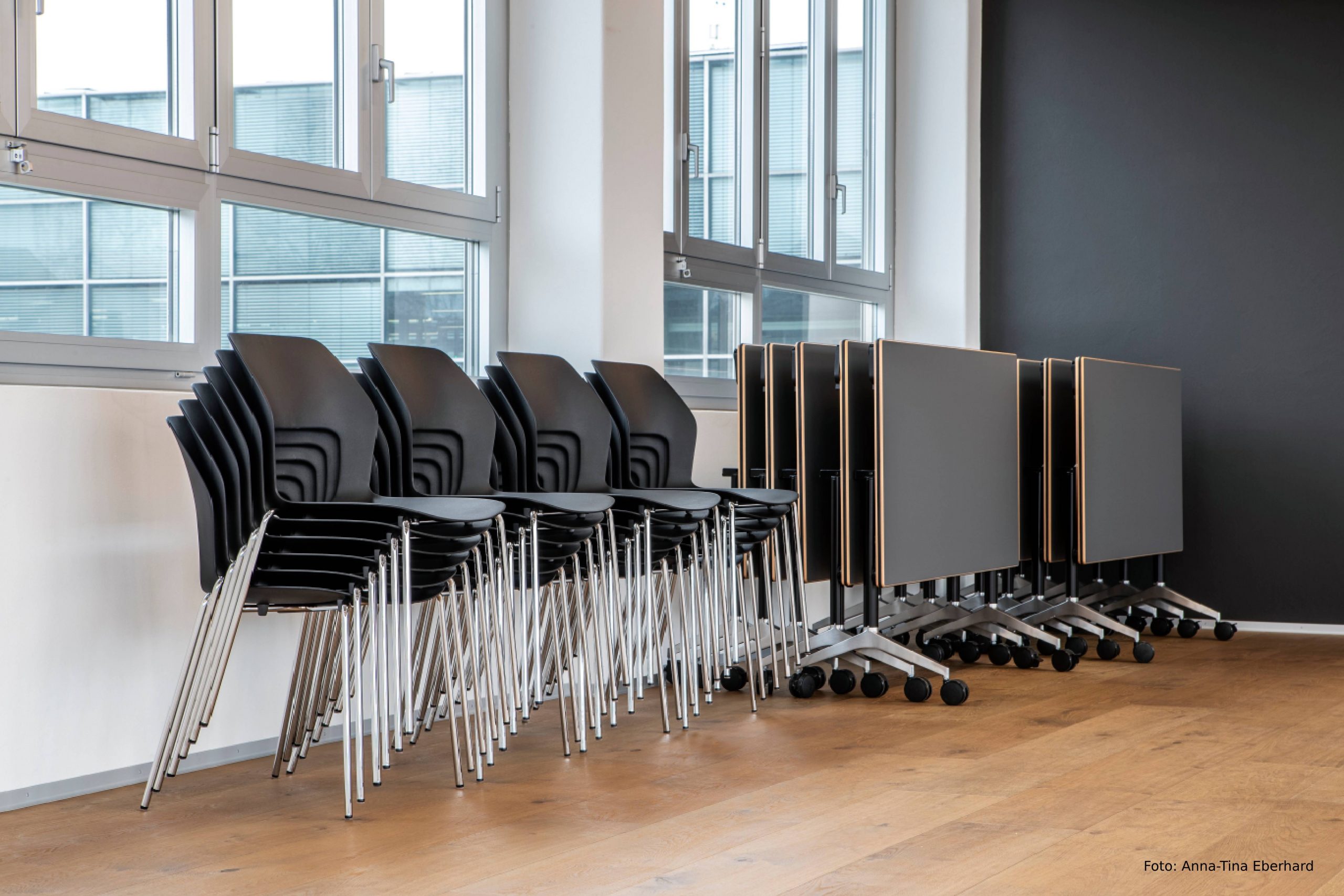 En un tour de main, les chaises et les tables de Wilkhahn utilisées dans la grande salle de réunion peuvent être empilées, repliées et rangées sur le côté, ce qui permet de gagner de la place. Photo : Anna-Tina Eberhard