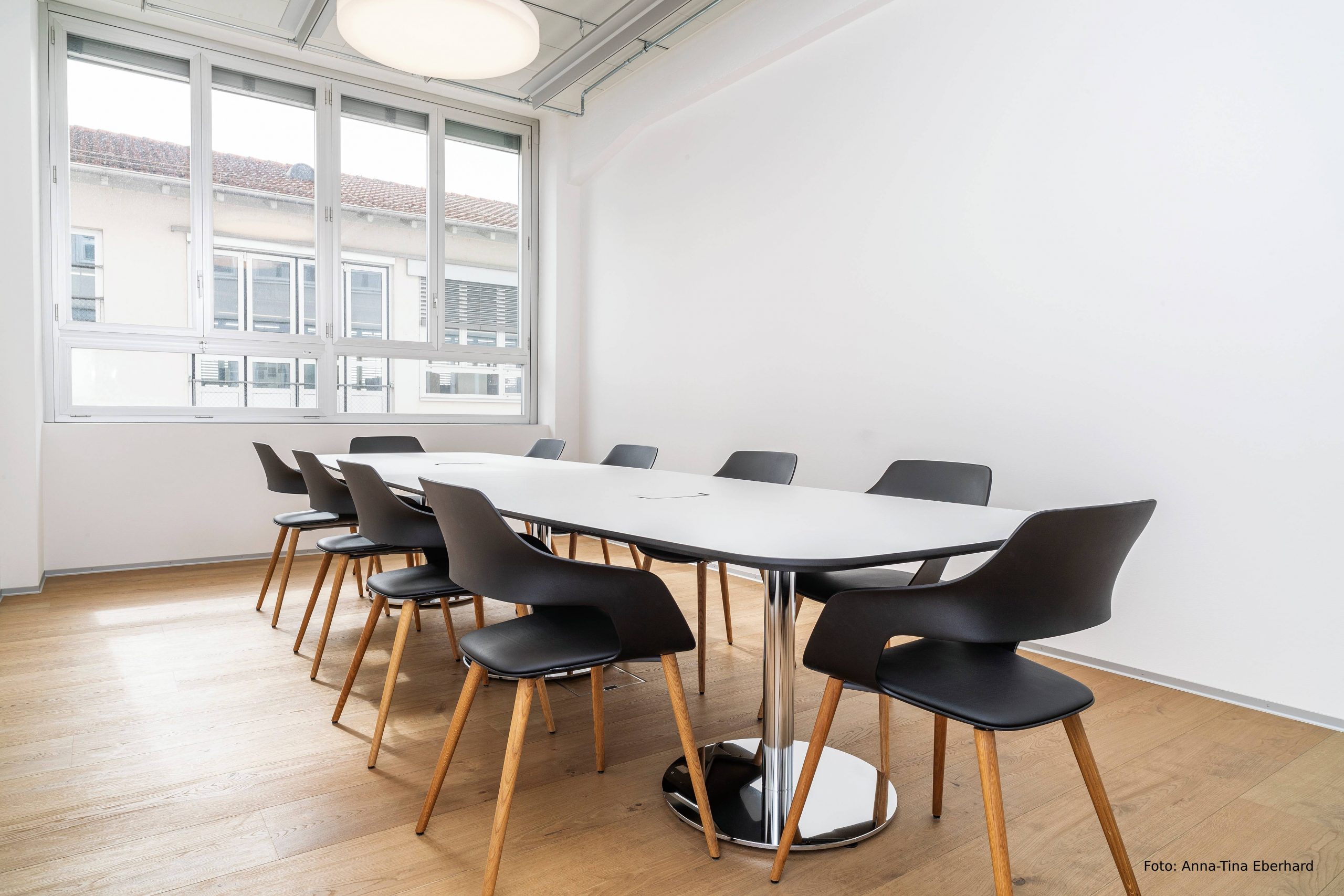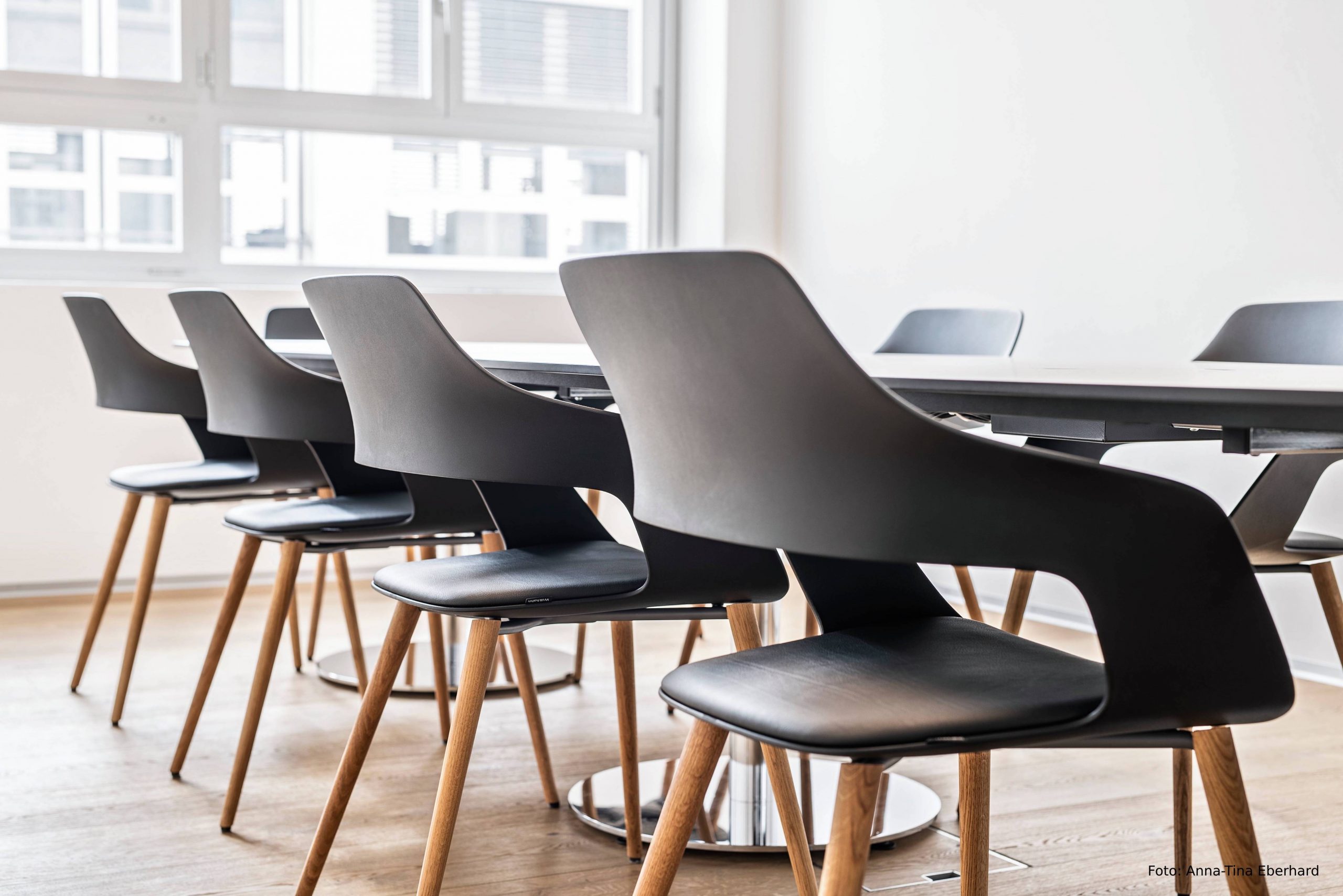Les petits espaces de réunion abritent des chaises Occo à rembourrage noir et pieds en bois naturel. Ces chaises universelles pratiques, très confortables avec la découpe caractéristique de leur dossier, permettent différentes positions assises et peuvent être utilisées partout grâce à leur forme compacte.