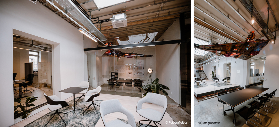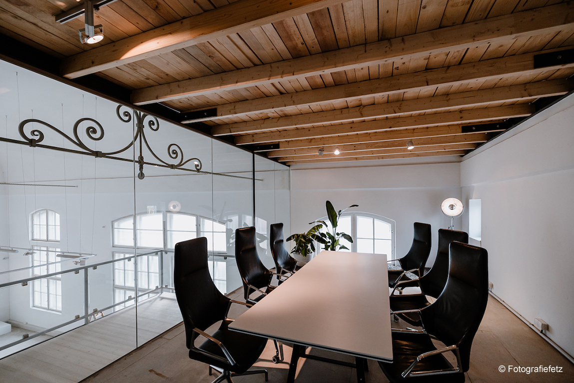 Protégée derrière un vitrage intégral, la salle de réunion est intégrée à la galerie et aménagée avec six luxueux fauteuils Graph. Photo : Fotografiefetz