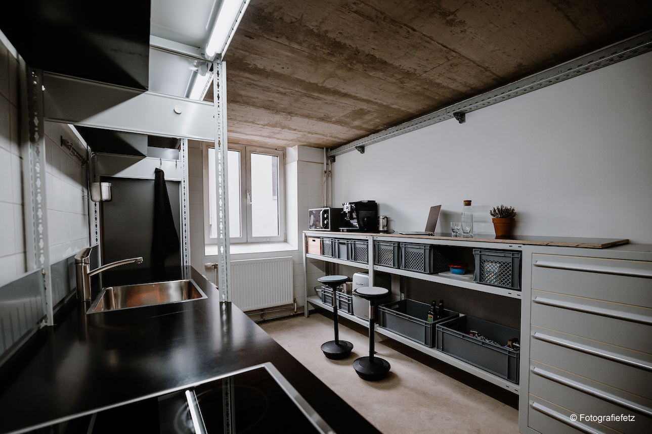 La cuisine étroite, avec ses armoires métalliques et ses éléments d'étagères techniques, reflète elle aussi l'ambiance d'un atelier, qui nourrit ici davantage le corps que l’esprit. Photo : Fotografiefetz