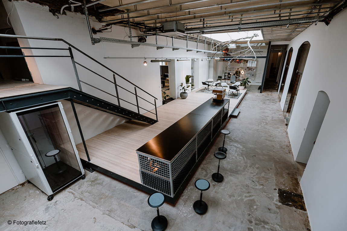 En direction de l'auditorium et de l'escalier menant à la salle de réunion, d'anciennes armoires de serveurs sont utilisées comme cabines téléphoniques et des caisses grillagées comme comptoir, tandis que les assis-debout Stitz permettent de rester en mouvement et de soulager le corps. Photo : Fotografiefetz