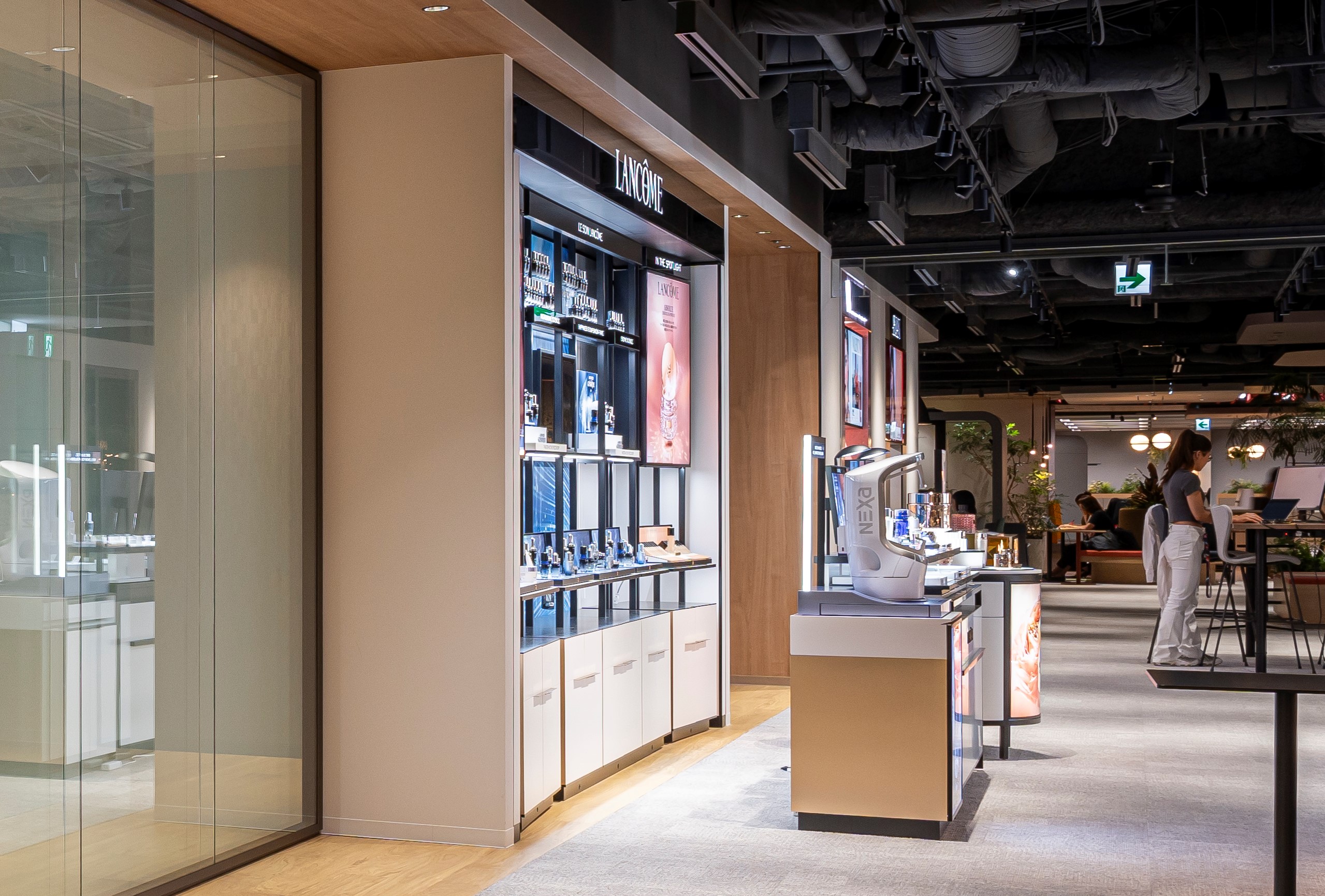 Away from the café, there is also an area modeled on the cosmetics department of a department store. Is this also about coming together?