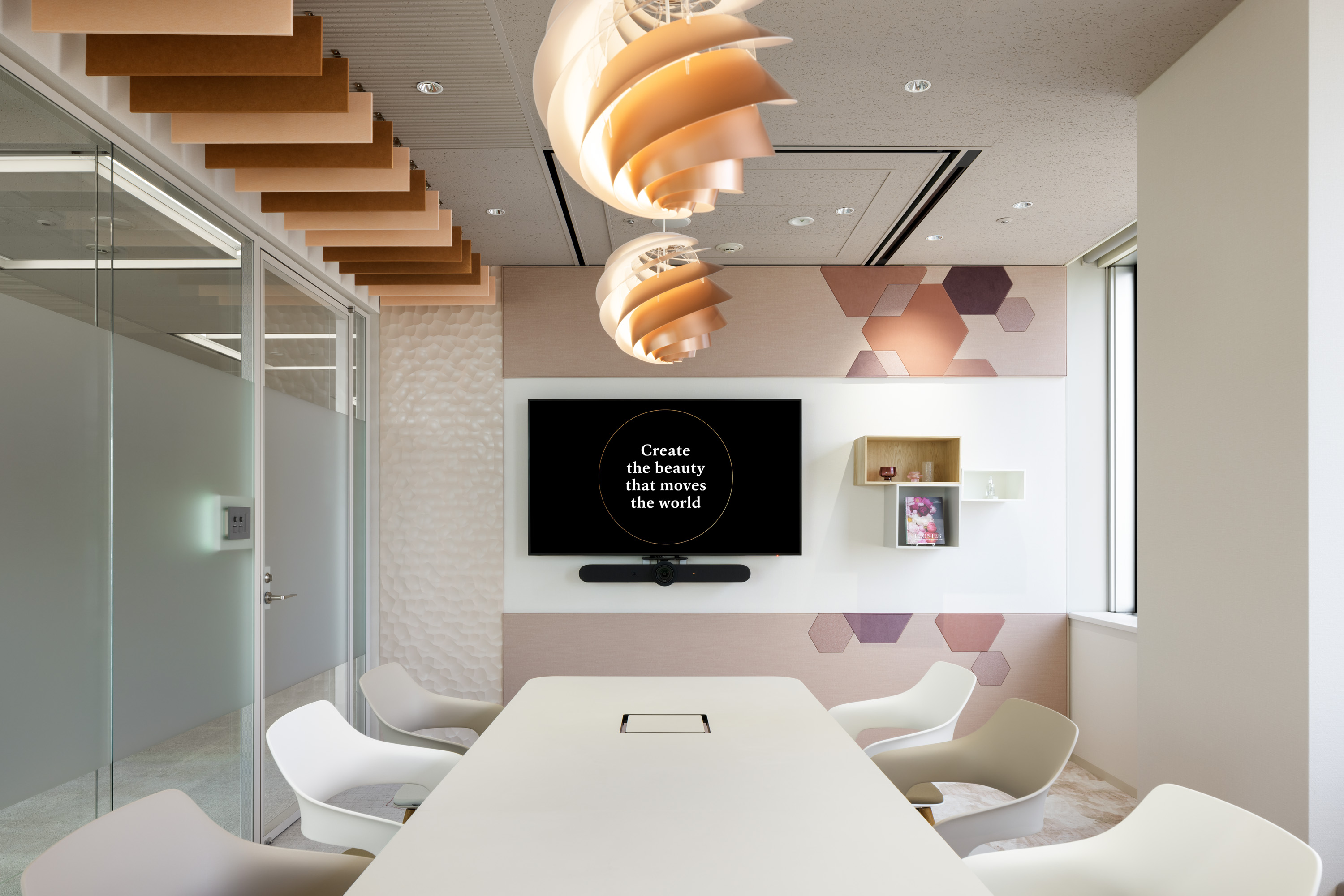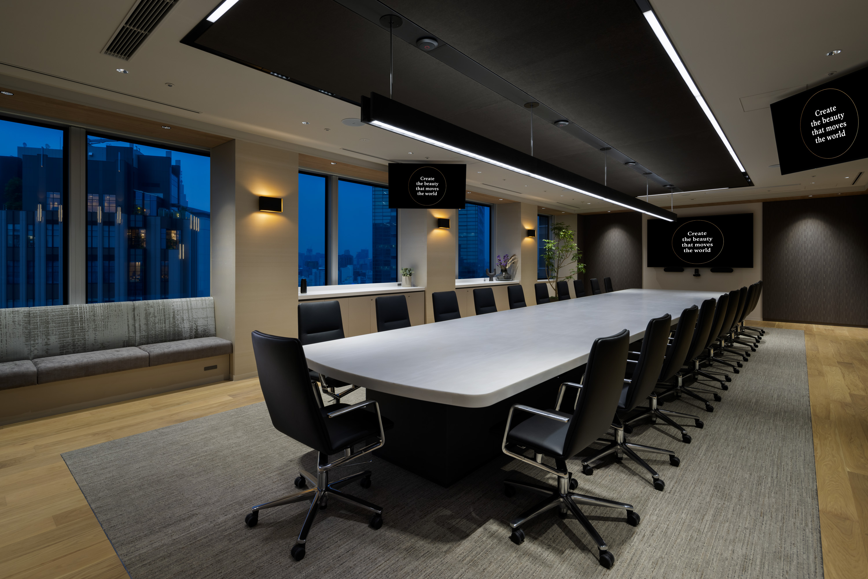The look of the back of the chairs used by the management team is important as they are reminiscent of a Zen garden. As you can see in “Beauty Valley”, luxury brands usually use the color black for product packaging. We wanted to convey this high-end impression in the conference room as well.