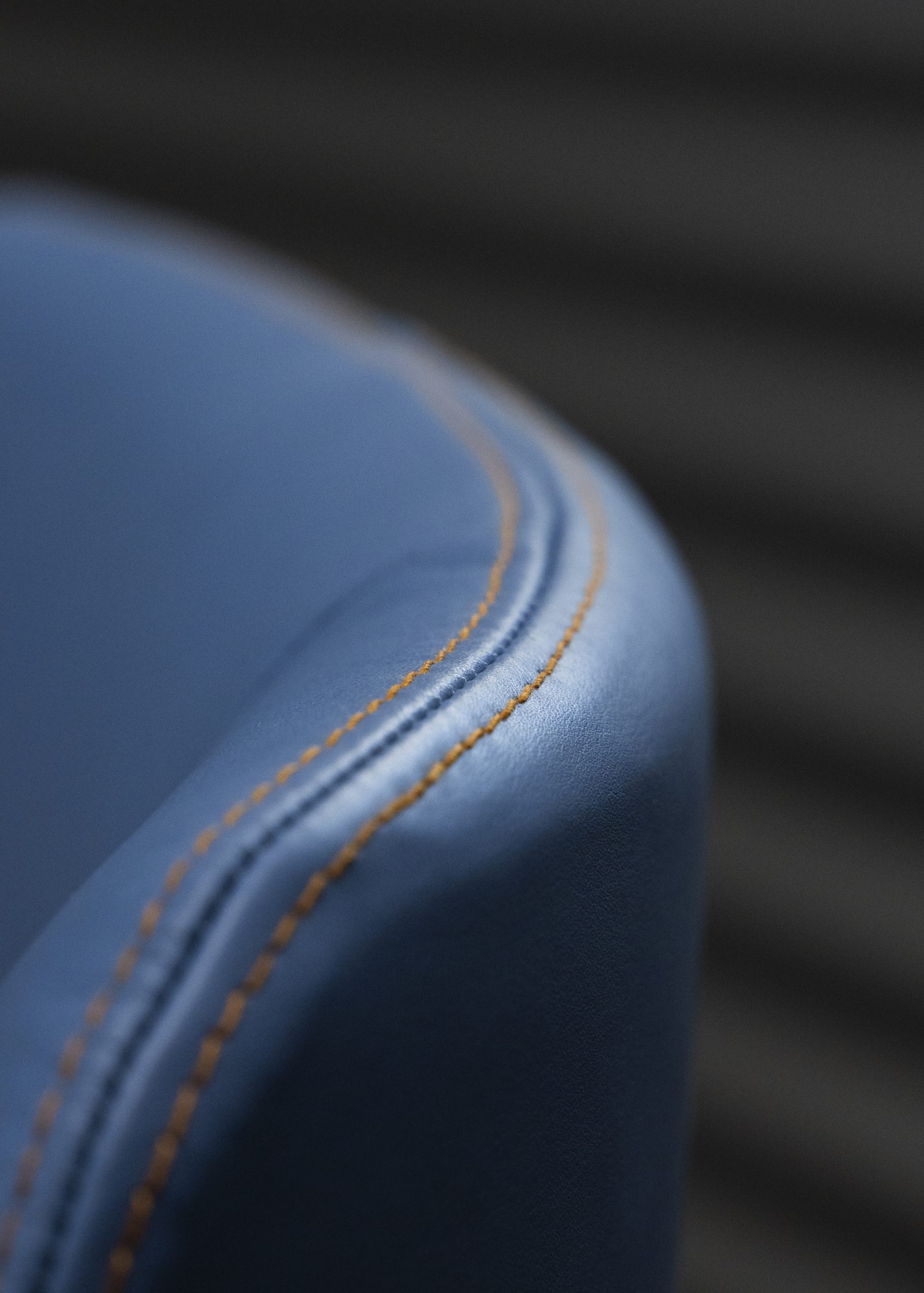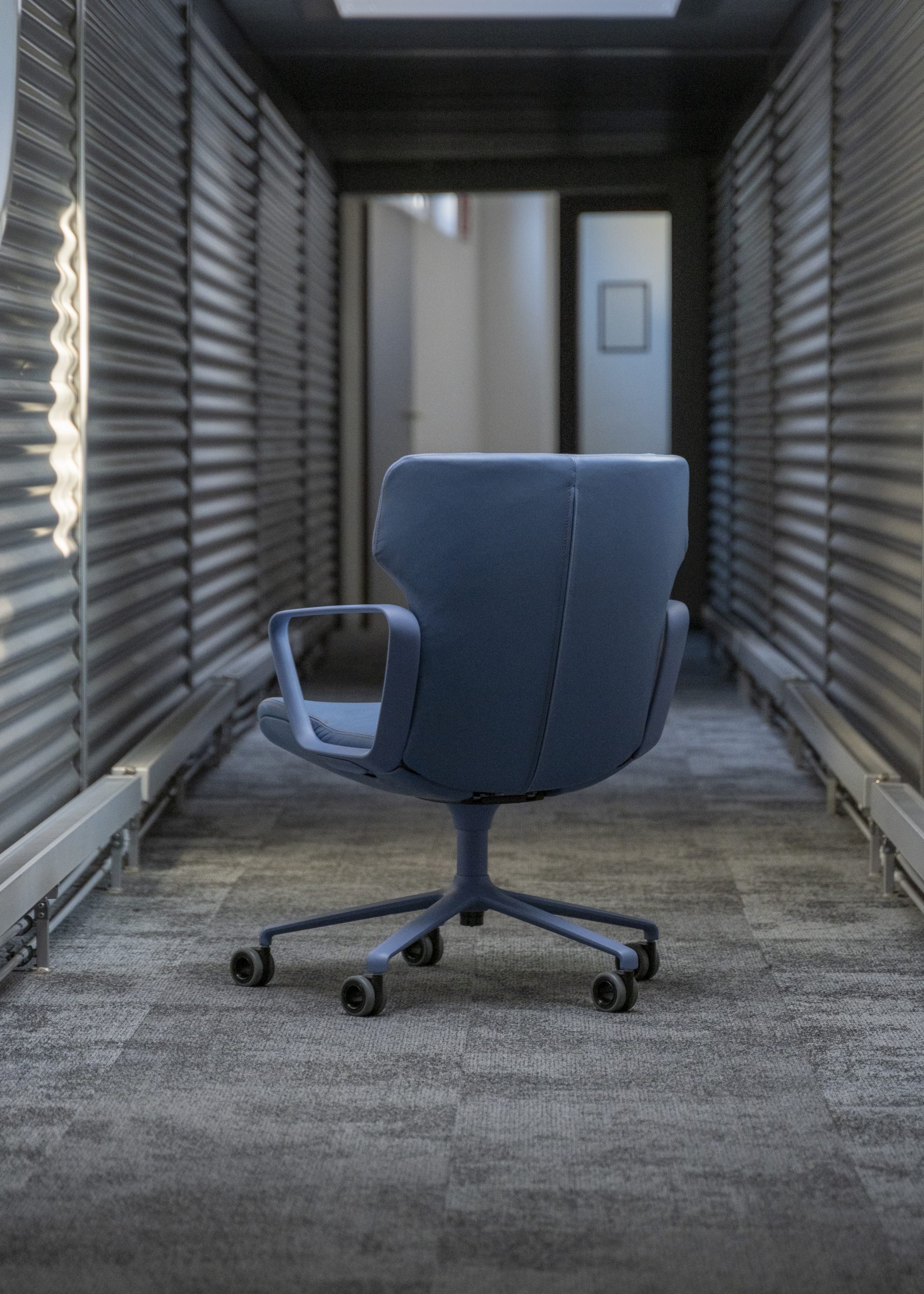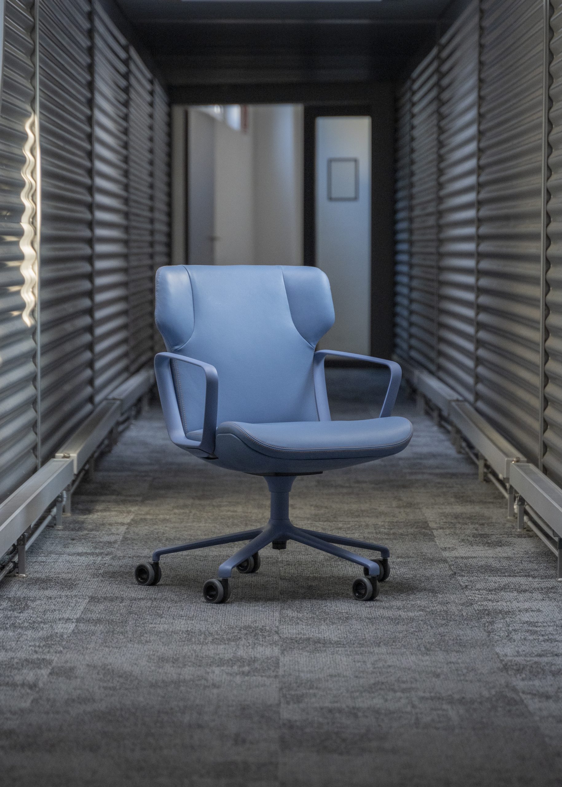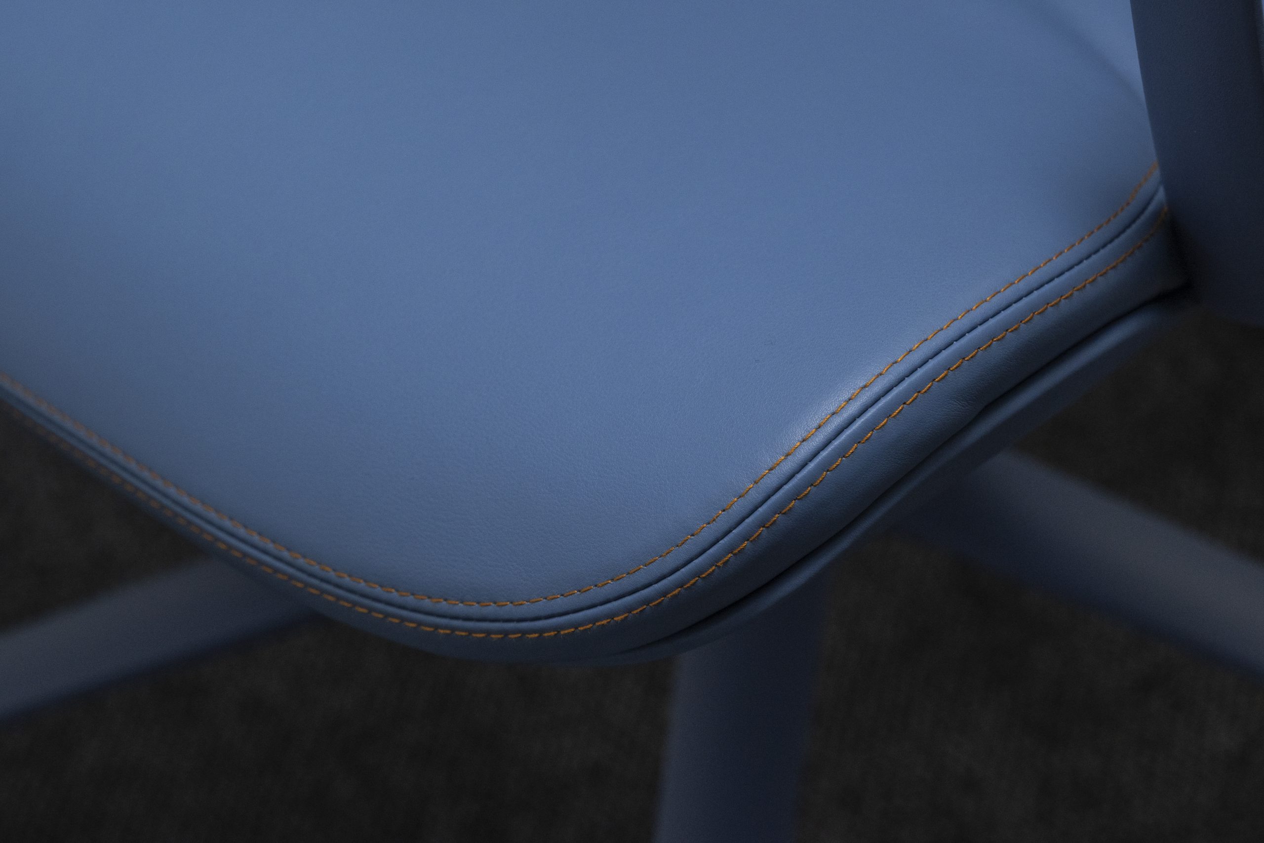 Upholstery: special leather “Naturale” / Finish: special powder in fine structure/matt and pigeon blue (RAL 5014) Photo: Wilkhahn